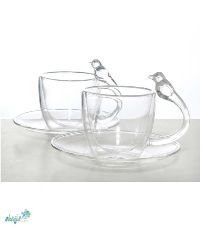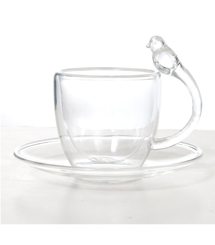 Luciano 80Ml High Borosilicate / Isotherm / Double Wall Espresso Glass Cup and Saucer (Cup with Bird Figurine Handle) Set