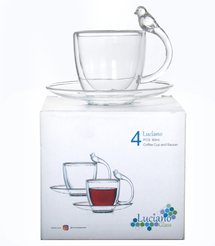Luciano 80Ml High Borosilicate / Isotherm / Double Wall Espresso Glass Cup and Saucer (Cup with Bird Figurine Handle) Set of 4