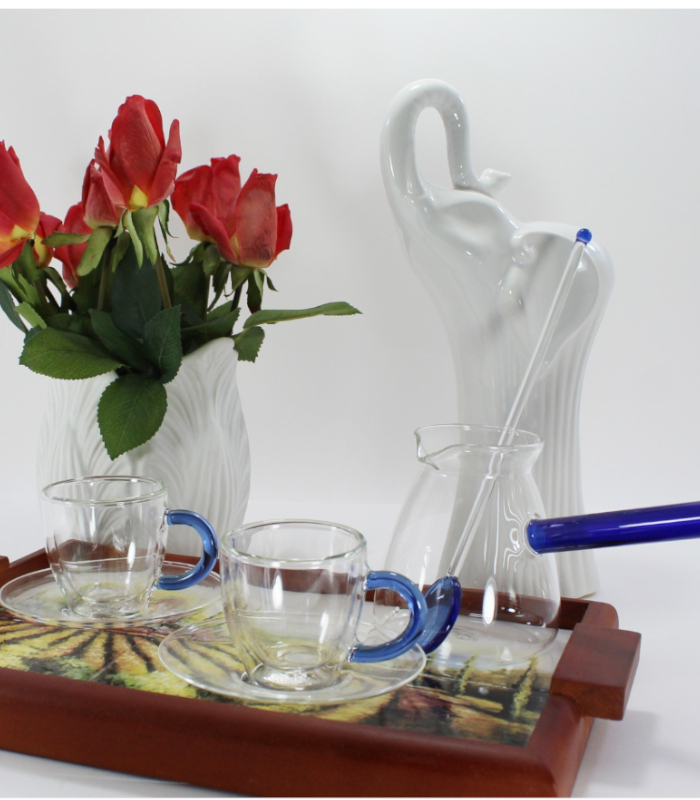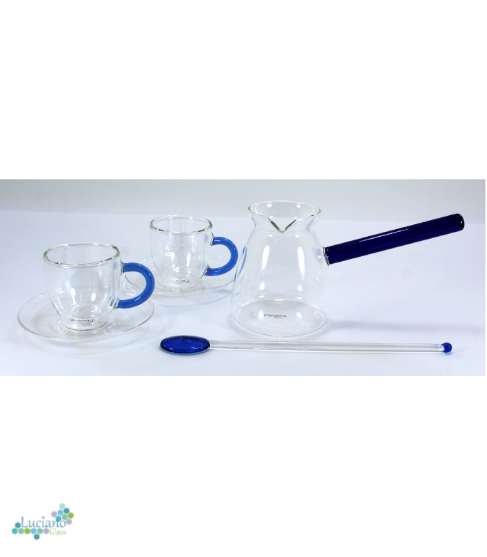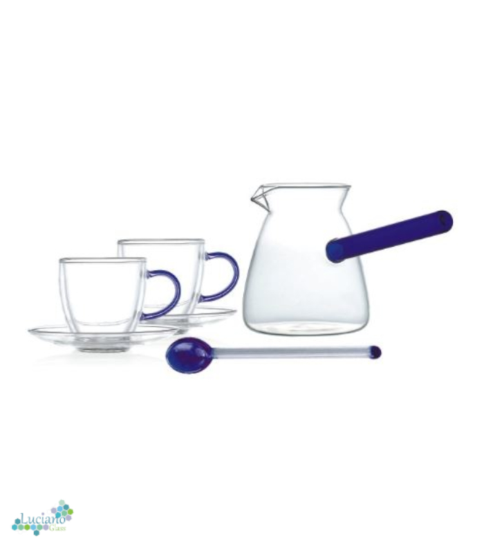 Luciano 350ml Borosilicate Glass Coffee Blue Handle Warmer / Pot / Kettle / Turkish Kettle / Blue Kettle / Milk Pot with 2 Double Wall 70ml glass cups with Blue Handles and saucers and 1 long handle Spoon with Blue Bottom and Top