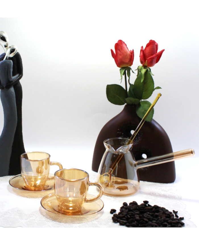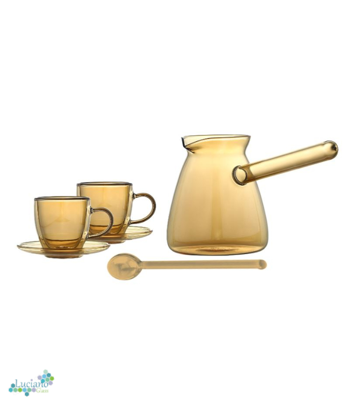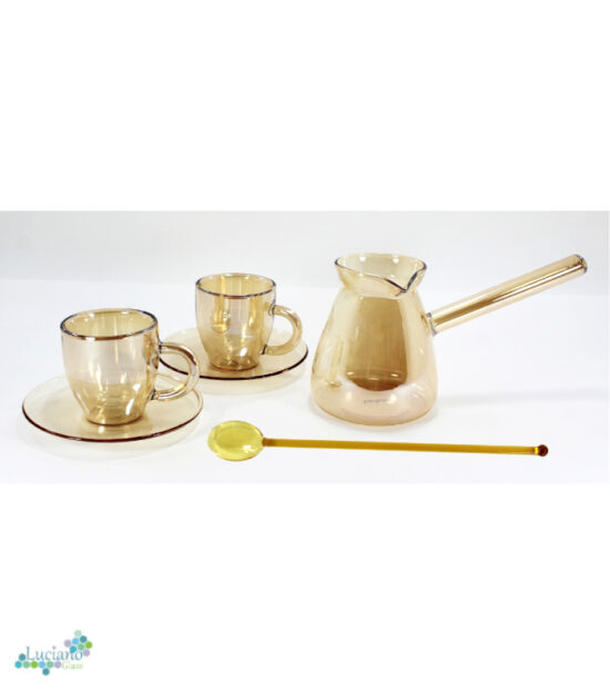 Luciano 350ml Borosilicate Glass Coffee Gold Warmer / Pot / Kettle / Turkish Kettle / Yellow Kettle / Milk Pot with 2 Double Wall 70ml Gold Glass cups and saucers and 1 Gold Long handle Spoon
