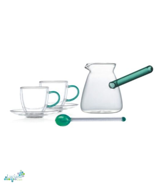 Luciano High Borosilicate 6PC Green Set: 2xDouble Wall Cups 70ml with Green Handle and Saucers with 350ml Glass Kettle with Green Handle and Long Handle Glass Spoon with Green Top and Bottom