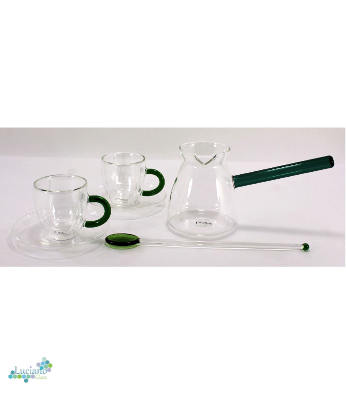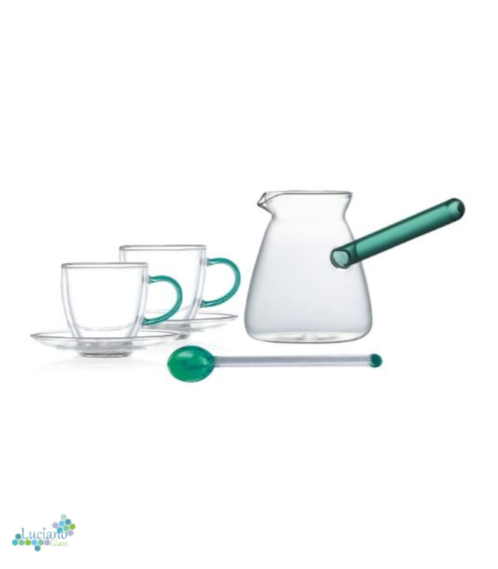 Luciano 350ml Borosilicate Glass Coffee Green Handle Warmer / Pot / Kettle / Turkish Kettle / Green Kettle / Milk Pot with 2 Double Wall 70ml glass cups with Green Handles and saucers and 1 long handle Spoon with Green Bottom and Top