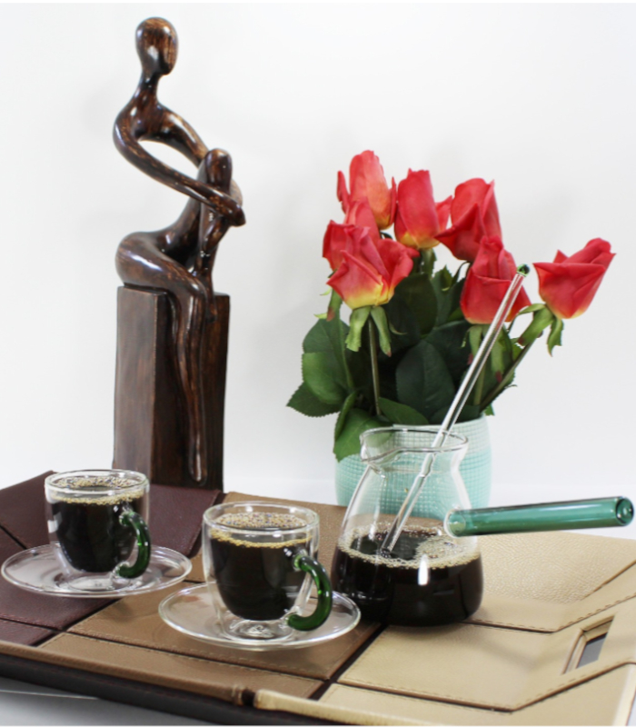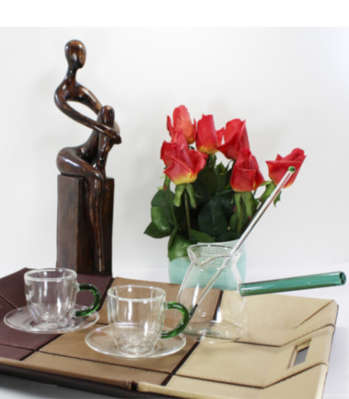 Be the first to review “Luciano High Borosilicate 6PC Green Set: 2xDouble Wall Cups 70ml with Green Handle and Saucers with 350ml Glass Kettle with Green Handle and Long Handle Glass Spoon with Green Top and Bottom”
