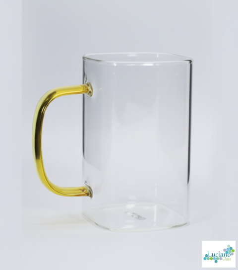 Luciano 270ml High Borosilicate Single Wall Square Glass Cup with Yellow Handle White Box